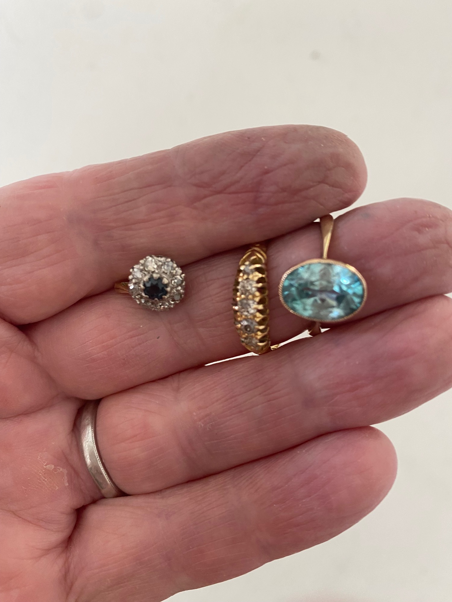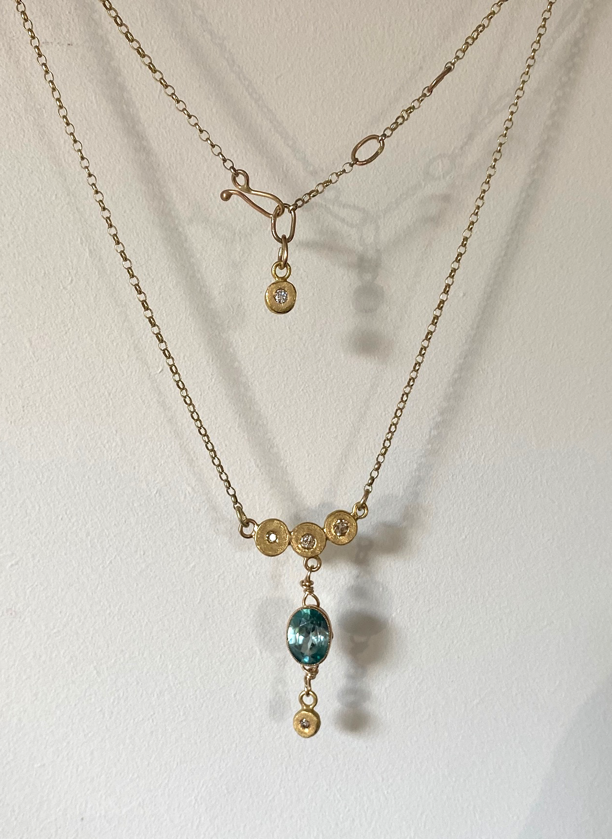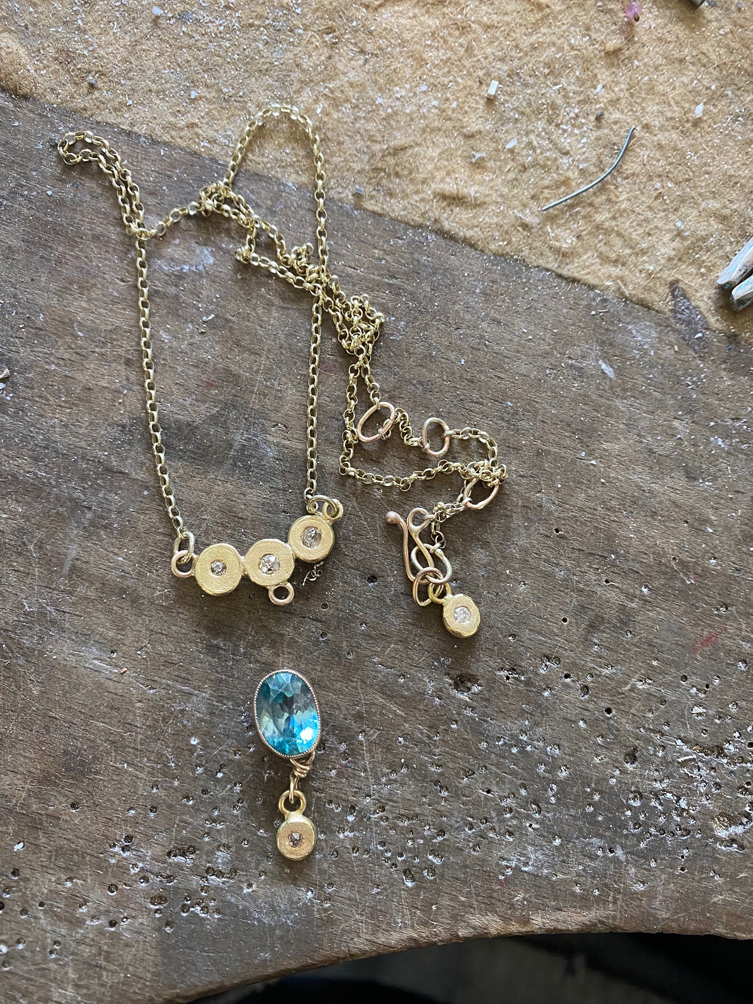 I used the gold from the ring shanks to make new settings and added some gold chain to complete the necklace. The stunning blue stone stayed in its original setting, carefully wired into place to keep its history intact.