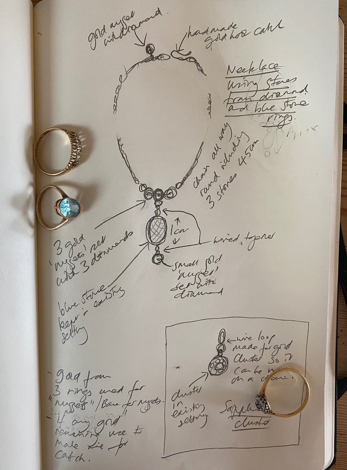 Over a few lovely Zoom meetings, Alex showed me the rings and we talked through her ideas. As I sketched, a design began to take shape — something light, elegant, and full of meaning. Once she chose her favourite, she sent me the rings, and I began the transformation.